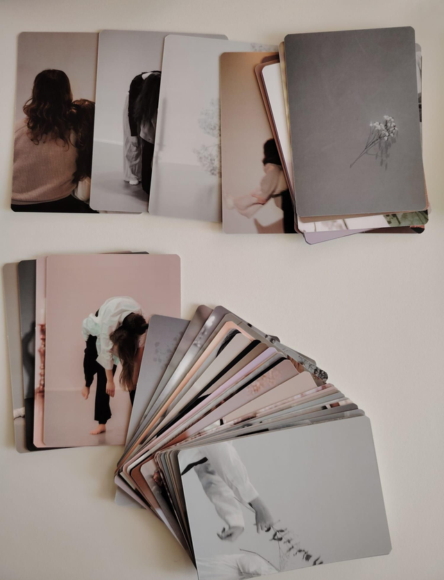 Kumpikin korttipakka sisältää 44 korttia, jotka ovat somaattisia ehdotuksia ja suuntaviivoja kohti kehon eri kerroksia, kehomielen tasoja ja minuuden eri puolia, ruumiillisen prosessin syventämiseksi. Ne syventävät kehosuhdetta ja parantavat kykyäsi erotella ja tunnistaa asioita sekä valitsemaan keinoja, joilla pääset tutuksi kehosi kanssa.